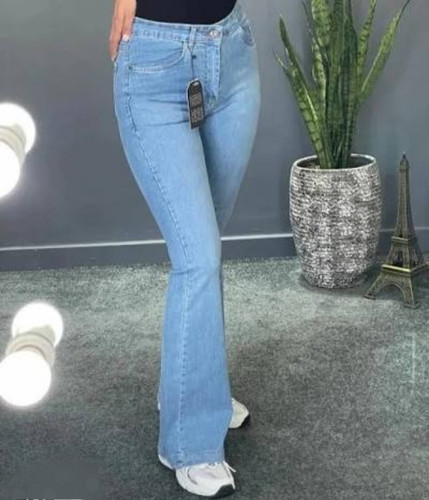 شلوار لی زنانه دمپا گشاد جنس فول کش رنگ ابی راندوم