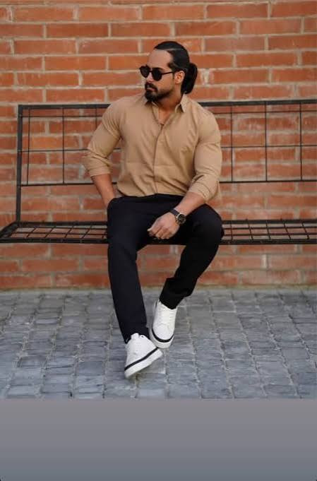 پیراهن مردانه سایز بزرگ دکمه مخفی رنگ نسکافه ای جنس دوشین ضدچروک