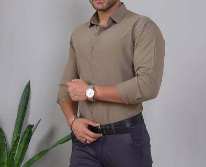 پیراهن مردانه سایز بزرگ دکمه مخفی رنگ موکا جنس دوشین ضدچروک